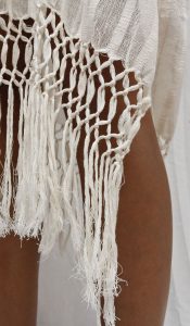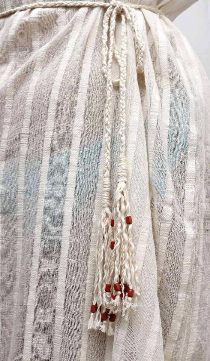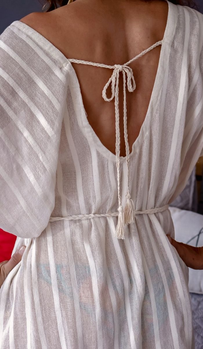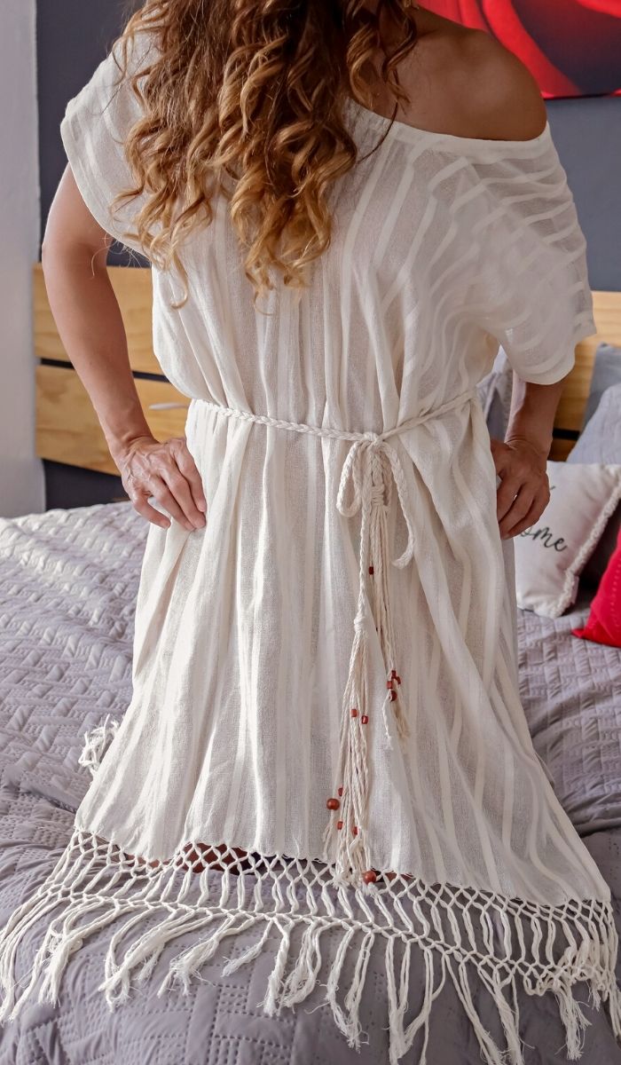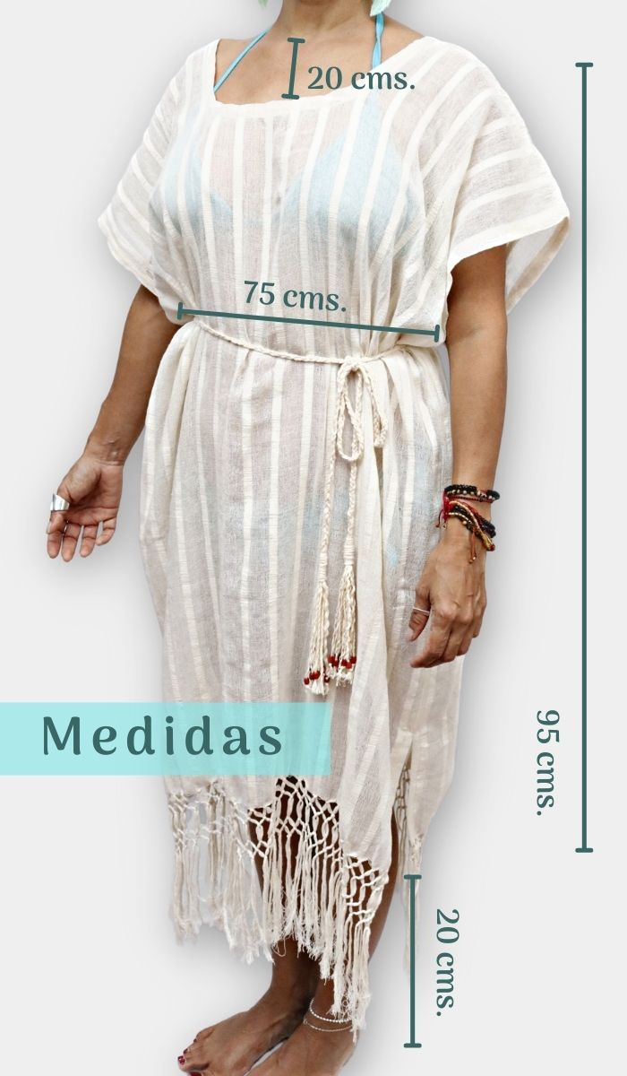 Vestido de algodón con deshilado en la parte baja por ambos lados, cuello medio al frente y escote en la parte trasera. Incluye un cinturón de cadena con cuentas de madera.